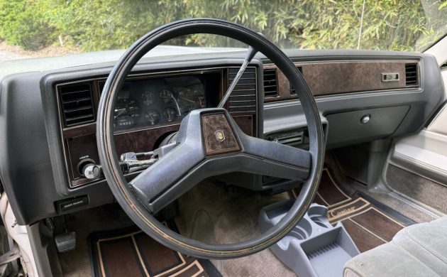 The interior looks outstanding with classic gray velour seats and power windows and power locks. The small pre-airbag steering wheels are pretty elegant. This one, even though it’s a Super Sport, has a column-selector for the automatic transmission – that’s not very sporty. There were graphics available for the exterior that the original buyer must not have been interested in, it gives this SS version more of a stealth look.