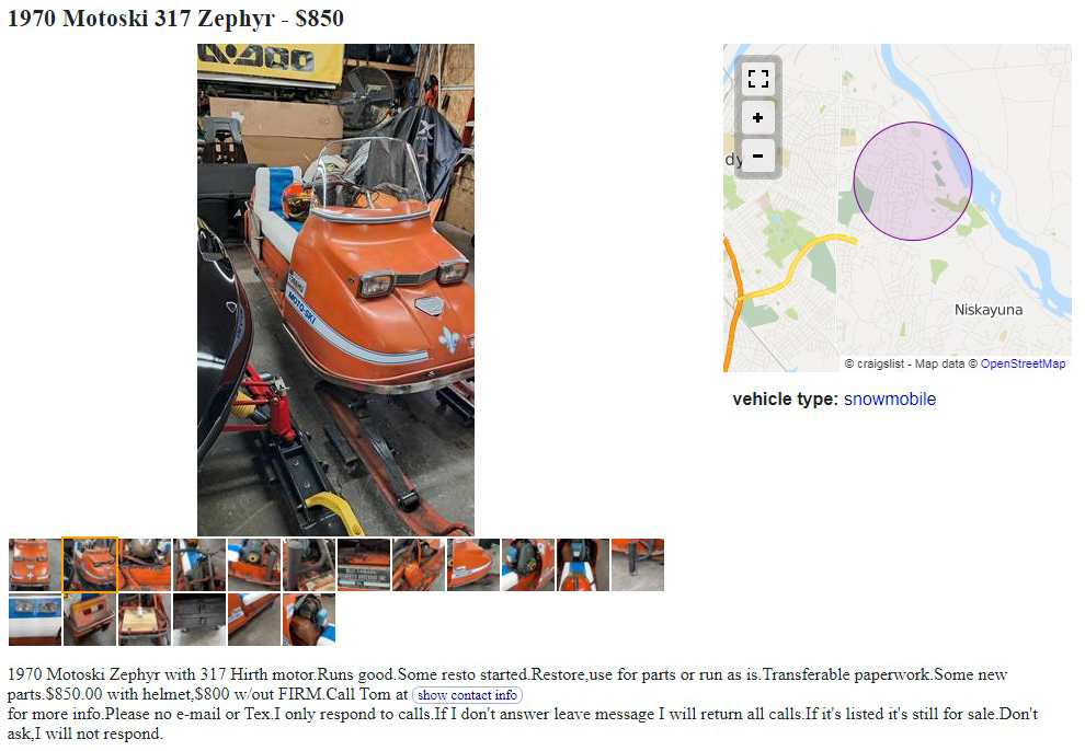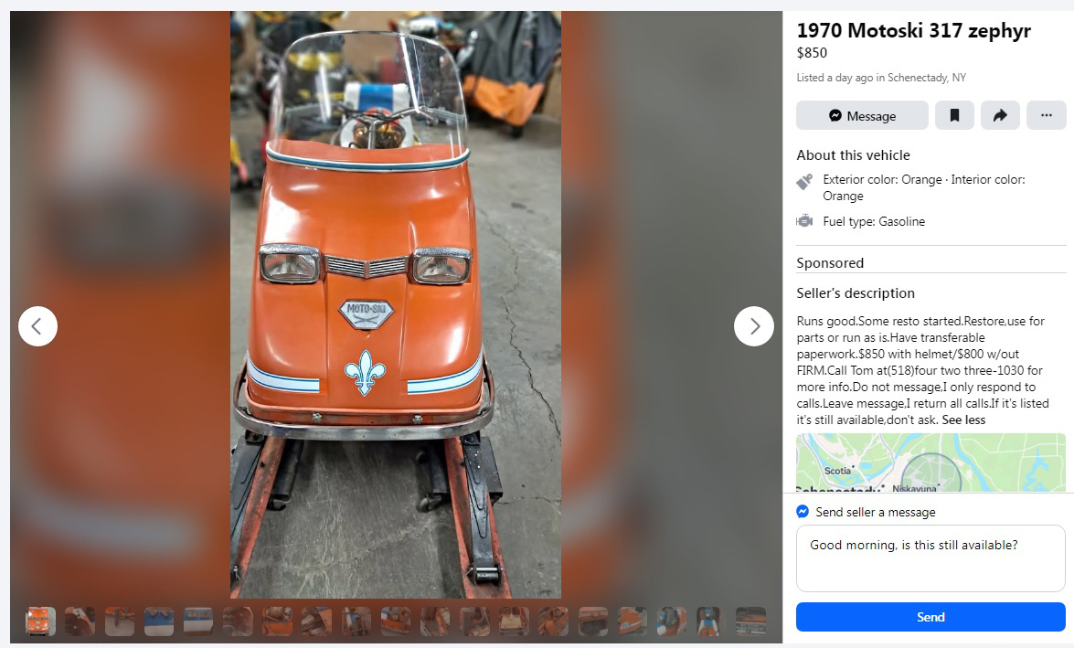 This 1970 Moto-Ski Zephyr 317 is listed here on Facebook Marketplace in Schenectady, NY, and they’re asking $850. It’s also listed here on craigslist in NY. Here is the original Facebook listing, and here is the original craigslist ad. How’s that for housekeeping! Don’t ever think that ol’ SG doesn’t care about the Barn Finds family, and that they may want to come back to these articles and see the original listings! Thanks to Gary for the great tip!