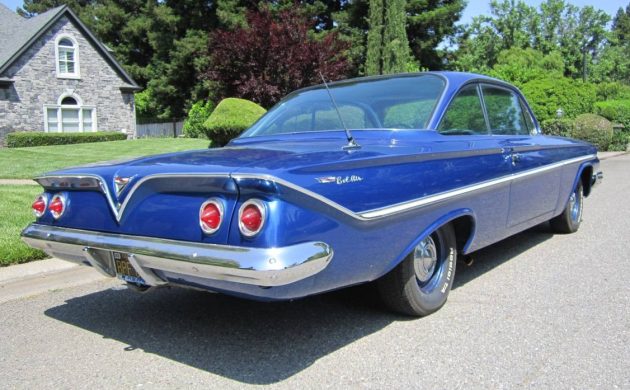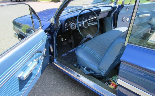 Not 4-speed, look at the column, a 3-speed with overdrive. This is one of the prettiest Chevies to come out of the 60s. Back in my service days one of my shop mates had a ’61 Impala, blue like this, but it had a Camaro Z28 running gear transplanted into it complete with the four speed. It also had the bucket seats from the same Camaro. That was a sharp car, and great runner too!