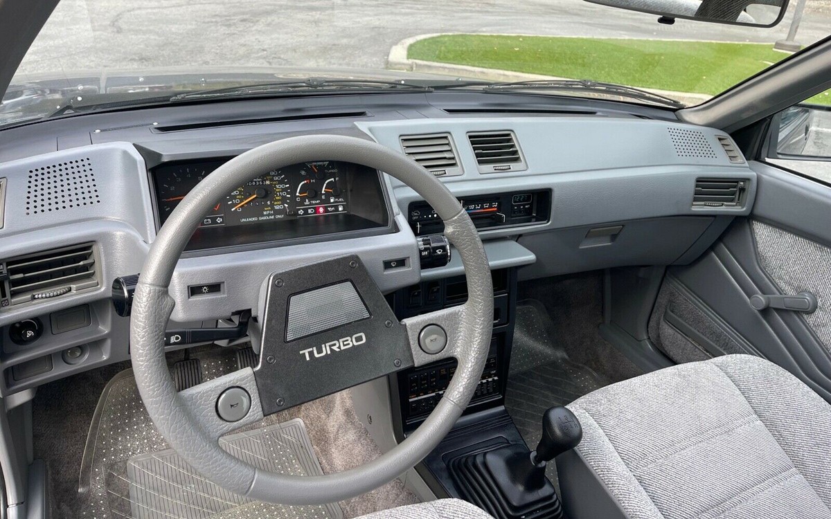 At one time we had 2 non turbo models of similar cars. A Dodge Colt DL 4 door and a Mitsubishi Mirage hatchback. Amazing fun little cars. The DL had all the goodies with the “sport suspension” and low profile tires. Handled great. A turbo in the four door would have helped and in the little 2 door hatchback would have been awesome. Our 4 door was the same color and trim as the one for sale but we had a trunk with a luggage rack with a small built in spoiler. Cool to see this listed.
