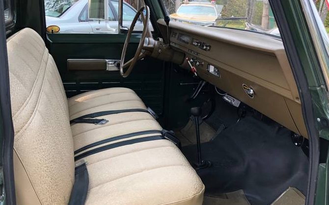 There’s really not a lot to say about this truck because firstly, the listing is very slim and secondly, there doesn’t appear to be any issue with the truck. The body looks like new, and one of the very few seller comments made is that the bed has never tendered a load. It is finished in an attractive two-tone light green/dark green finish which is demarcated along body lines similar to Chevrolet’s newly redesigned 1973 pickup truck. The narrow white-stripe tires are indicative of this truck’s era, they are usually found today only as expensive reproductions. To state the obvious, this truck has obviously been stored properly, indoors, and not driven in Maine winters. The bed does look unused, there isn’t even a notable scratch.