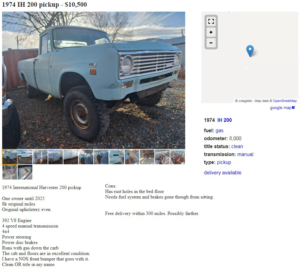 The 1974 International pickups were renamed again, this time with just three digits representing the weight rating. This 1974 International 200 is a 3/4-ton 4×4 and International had the widest stance of any pickup of the era. They also had a new grille, and this solid example can be found here on craigslist just southeast of Baker City, Oregon, and they’re asking $10,500. Here is the original listing, and thanks to Rocco B. for the tip!