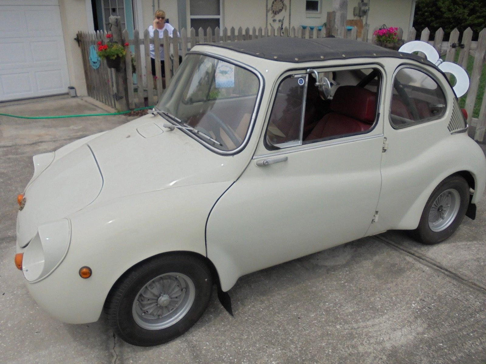 The fiberglass top insert was considered a structural component of the body. While it was fairly easy to cut the rubber gasket and remove the top insert, removing it severely weakened the already questionable structural integrity of the unit construction body. which is probably why the Hot rodders decided to fabricate the roll bar.? The car was never intended to operate as a convertible and the factory manual advised against doing so. NO convertible version was ever offered. The top pictured here is really just a snap on Tonneau cover. The seats are definitely not Subaru, and the oversized seats combined with the intrusion of the roll cage have probably reduced the already cramped interior space making it difficult for anyone over 5 foot 6 to even fit. In my opinion, the hack job mod’s on this car have decreased it’s value over what it would be worth in stock condition (which isn’t much, nicely restored one’s are selling for about what the ask is here)