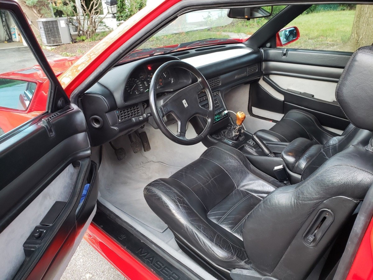 The Shamal utilized Maserati’s familiar cocktail of displacement and turbocharging, pairing a 3.2L V8 to twin turbochargers and intercoolers, delivering a robust 321 b.h.p. and 320 lb.-ft. of torque. The Maserati also featured a limited-slip rear end with a manual transmission, capable of propelling the Shamal to 60 in 5.3 seconds. As seen here, it also came with deeply bolstered sport seats, but far less wood trim than was typical of Maseratis from the 80s.