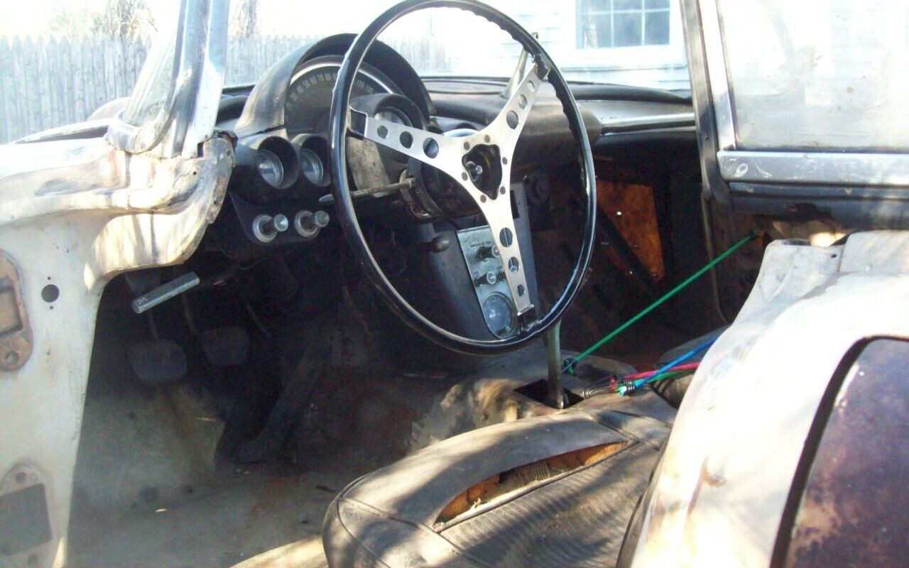 The interior is about what you would expect. The dash and instrument panel are both still intact (the tachometer’s 6,000 RPM redline suggests that this ‘Vette was powered by one of the more potent 283 engines) but the upholstery and door panels are cooked. It is a small environment but for those who would consider a restoration it will need a complete redo.