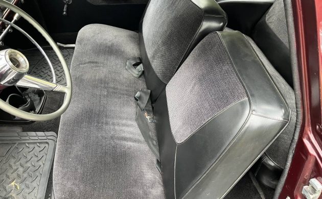 Upfront is an overhauled 90 gross HP, 195.6 CI, in-line six cylinder flathead engine, driving the rear wheels via a three-speed manual transmission. The seller adds, “motor overhaul including hardened valves and guides, new timing chain, rings, and all engine bearings, electronic ignition and carburetor updated.” The engine compartment is quite tidy and mostly original looking, though I’m not certain about the carburetor, and the air cleaner is obviously not the born-with piece.