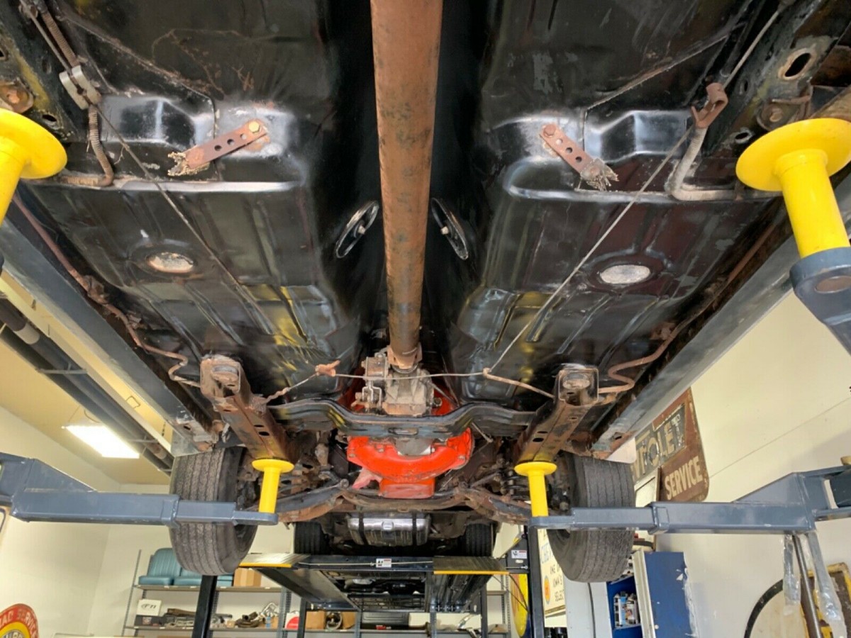 The owner claims that the Fathom Green paint that this Camaro wears is original and has never received any touch-up or repaint work. It is in good condition for a car that has been sitting in a barn for decades, and you would have to think that the environment must have been pretty favorable. The paint has a few small blemishes, but it remains presentable if the buyer intends to retain the vehicle as an original survivor. The chrome and trim are in good order for that purpose, and the same is true of the glass. This is a late 1960s pony car, which means that we need to tackle the question of rust at some point. You can see a small area of rust in the lower rear quarter panel in this photo. There is a matching section on the other side. The owner believes that the paint has been gravel-blasted and that the bare steel has started to rust from the outside. That sounds like it would be a possibility, and some of the photos seem to support this claim. Beyond those two spots, the panels are clean. There are no issues with the doors, rockers, or the lower fenders. However, that’s just the entree. Let’s get this old girl up on a lift and take a look underneath.