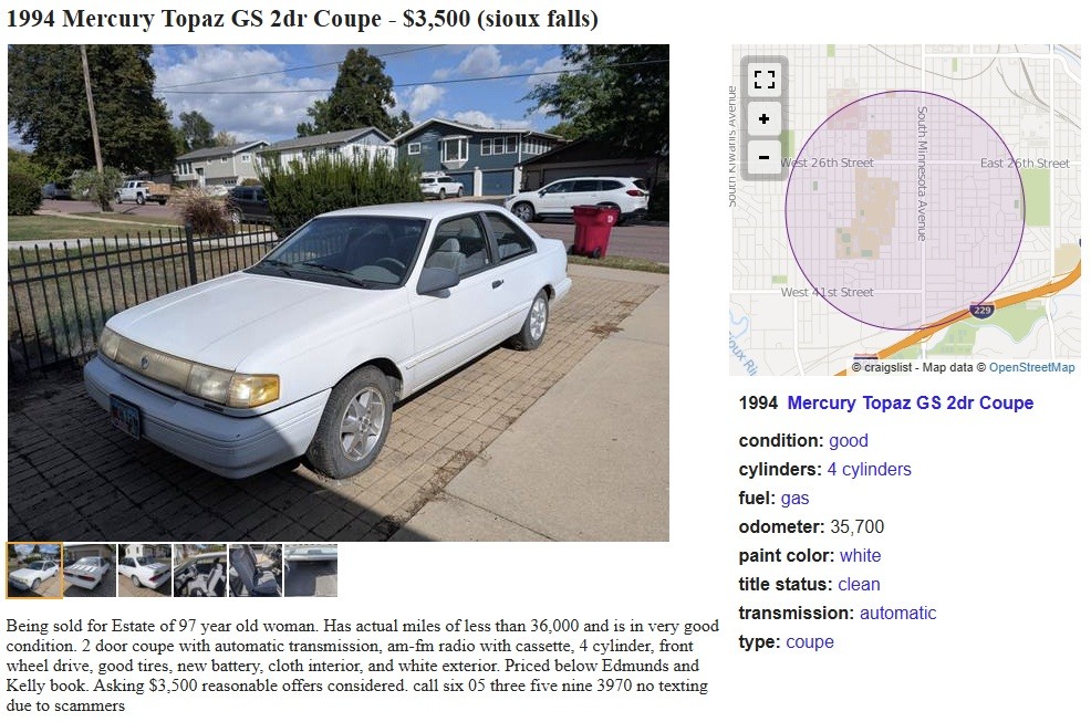 Said to have been owned by a 97-year-old woman and purchased from her estate, this 1994 Mercury Topaz GS two-door sedan is showing just 35,700 miles and looks nice in the photos. The seller has it posted here on craigslist in Sioux Falls, South Dakota, and they’re asking $3,500 or a reasonable offer. Here is the original listing, and thanks to Jack M. for the tip!
