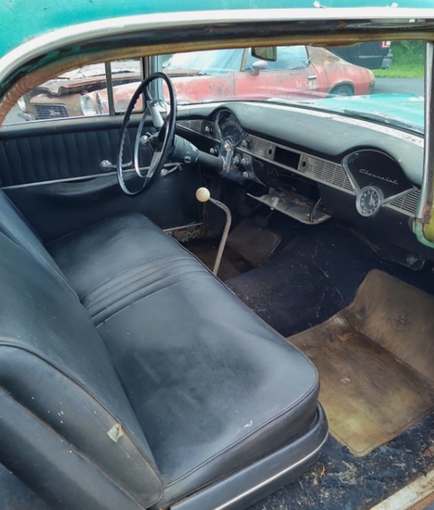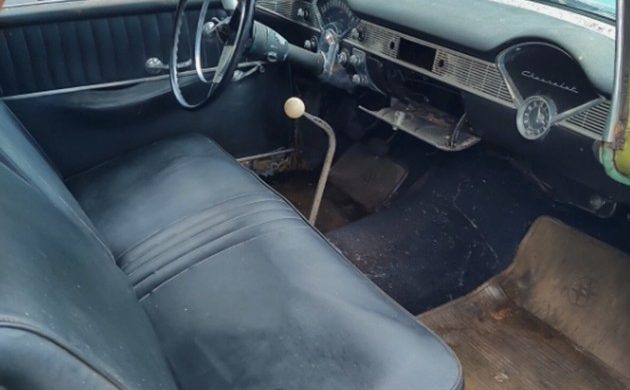 The seller’s ’56 Nomad is one of 8,100 assembled that year. Wearing what we think was once India Ivory and Sherwood Green paint, this Nomad may be 99% complete, so hunting for rare parts could be minimal. We’re told it was purchased new in California and made the trek to Connecticut in 1978. A period-correct V8 sits below the hood and may have never been touched, though do we see an alternator instead of a generator? And the 3-speed manual is floor-shifted (also a change?).