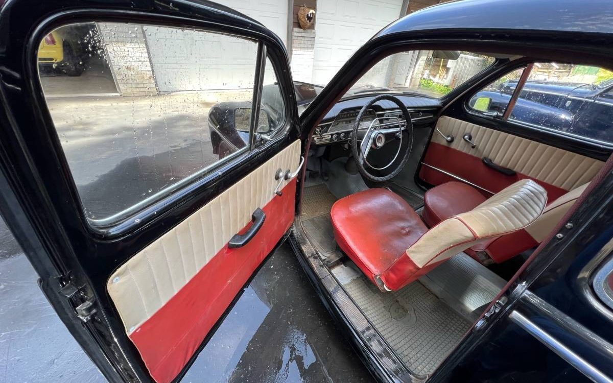 I had a ’60 Volvo in white that looked just like this ’59, (but it was a bit beat-up looking with pitted chrome and faded paint) with the same engine and all. It didn’t have a thermostat for the radiator, and there wasn’t one available. Instead, it had a roll-up canvas cover for the radiator that you pulled up over the radiator in the winter to get the engine warm, that was done by pulling a spring-loaded beaded chain on the dash and then setting a chain link in the slot on the chain pull to keep it there, which pulled the canvas cover up over the front of the radiator. When the temperature gauge got to where it needed to be, you simply let the chain back out and the canvas cover would roll up on its own below the radiator. It wasn’t as convenient as a thermostat, but it worked fine. – I think many semi diesel trucks still have this feature. – My ’60 Volvo also had a manual choke activated from the dash, which also worked fine to get the engine started easily.