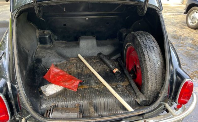 The dirt and vegetation in the trunk reminds me of using my family heirloom ’65 Mustang to cart my lawn mower around to my two high-school lawn mowing jobs; the mower fit perfectly in the trunk (and no, the car wasn’t very nice at the time).