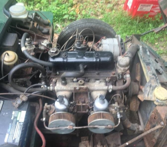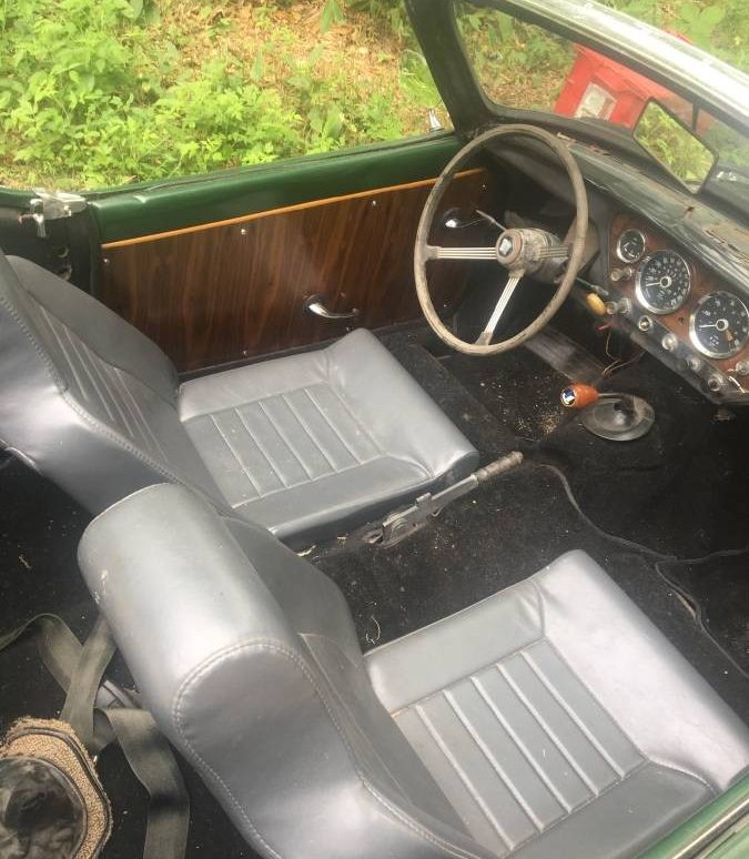 Talk about ease of maintenance! Just flip forward the hood and everything is at your fingertips. The Mark III Spit’s carry the 1296cc engine, which has around 75hp. More than enough to get a top speed of around 95 mph. The engine bay looks tidy and is said to run. However, it will need a good tune up. One spark plug lead has a different colored boot, which may mean at least some ignition work has been performed. Getting the tune correct on the dual SU carburetors is probably the most difficult mechanical task on this car, but there is plenty of literature available on the web to get those often misunderstood twins set up properly.