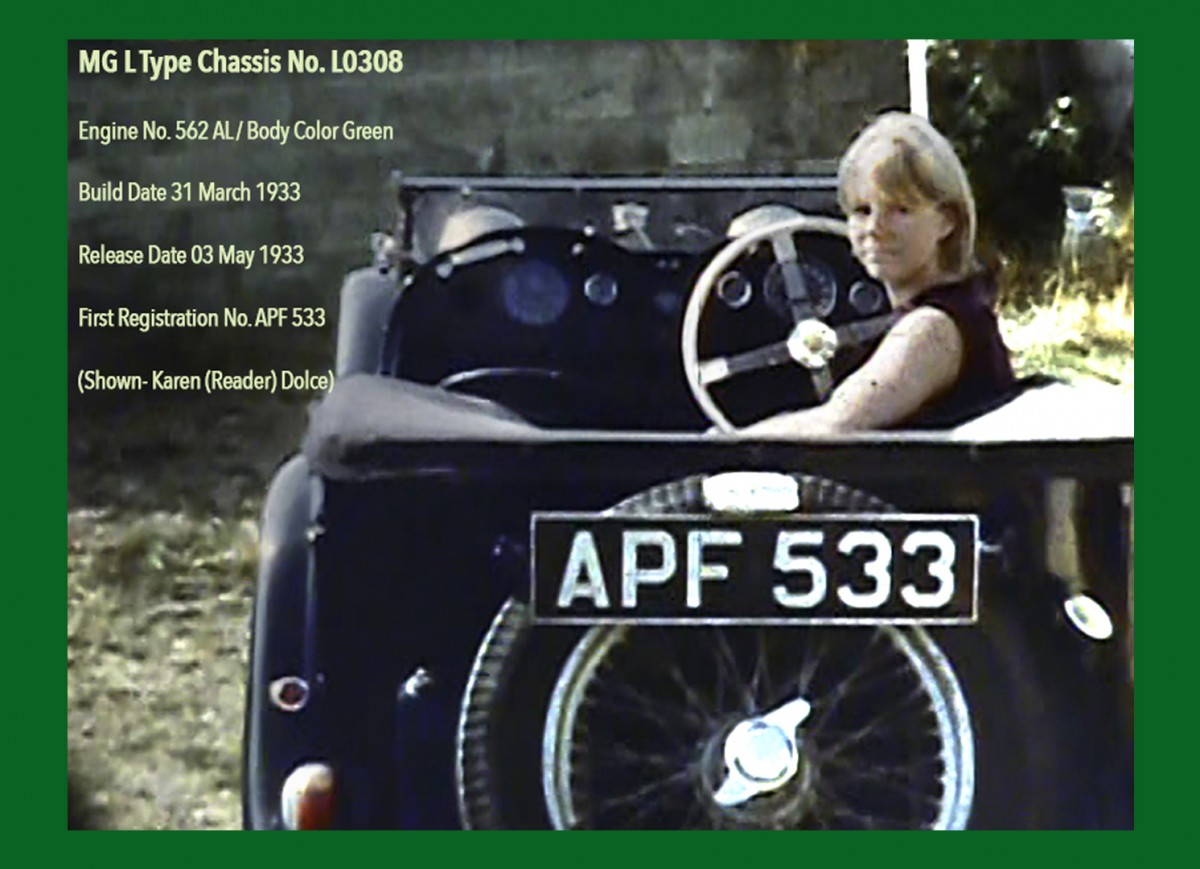 Unlike many of the pictures we see, the ones of these cars are quite artistic as well as showing details of the cars’ condition. This is the chassis of APF533, an L-Type Magna originally equipped with a green body and blue seats. You can see it below while it was still driveable. Mr. Reader and his wife often drove their MGs and were active in tours and meets.
