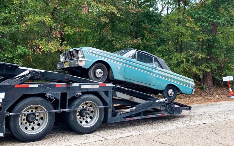 This story starts in April 1964, when Alan P buys his very first car from Verner Cadby Ford in New Jersey. He purchased a new 1964 Ford Falcon Convertible from the dealer, with his parents at his side. He spent the next few summers driving the car and then takes it with him when he heads off to college. He continued to drive this car after college and eventually started a family, with a wife, three boys and this Falcon. As time goes by, he drives his Falcon less and less. Finally, in 1982 the car gets parked in Rutherford, New Jersey, at his mother-in-law’s house. Unfortunately, he and his wife get divorced and then the car was given to his oldest son James. It was signed over on October 30, 1996. James, unfortunately, had to leave it outside. Eventually, his brother Keith decides he wants to restore the car for their father, as Keith has lost contact with him. Keith titles the car for restoration on November 25, 2016. Keith arranges transport to Texas and the car arrives on 12/12/16 to Newman’s Auto in Conroe, Texas.