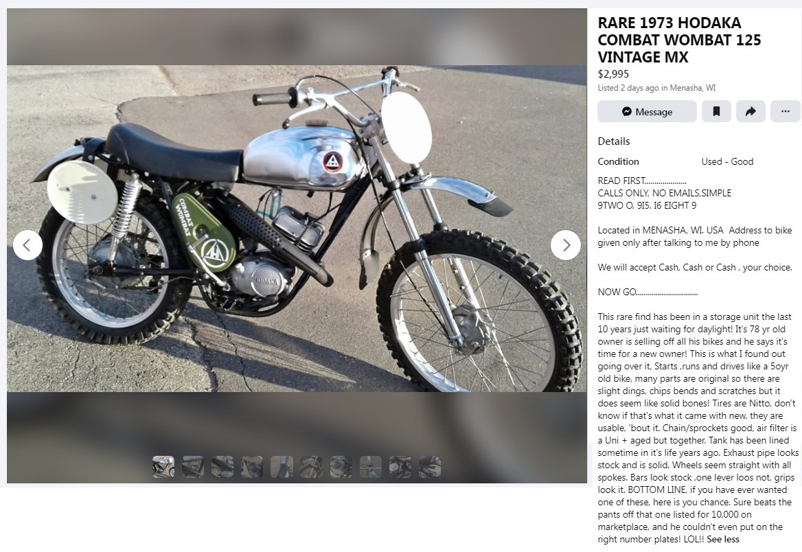 Having owned a few of the Combat Wombats during the 70’s the memories come screaming back. Hodaks’s were “good” bikes but were always considered stepchildren to the XR’s, YZ’s and RM’s of the times BUT what they did have going for them was affordability. Now you are seeing quite a few of these on BAT and other platforms and they seem to command a pretty penny. This one seems to be priced fairly reasonable in comparison. All across Facebook and Instagram there is a “resurgence” of the Hodaka namesake and people seem willing to pay a hefty price for the brand 50 + years later!