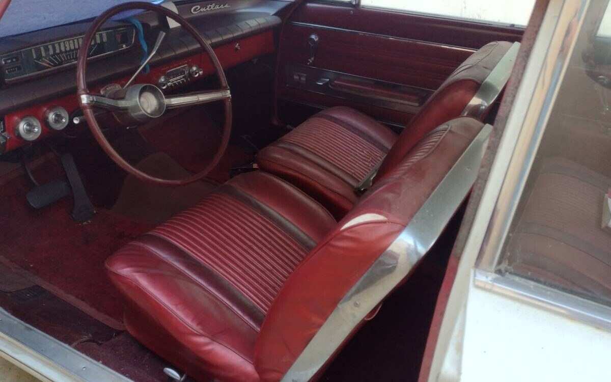 The bucket seat interior, from what can be seen, still looks pretty good. The red vinyl upholstery is showing one seam split in the driver’s seat backrest and the top of the rear seat backrest is disintegrating, likely due to years of sun exposure. Interestingly, the bucket seat arrangement did not necessarily include a center console as there isn’t one in place. Olds literature from 1962 mentions the console as an option.