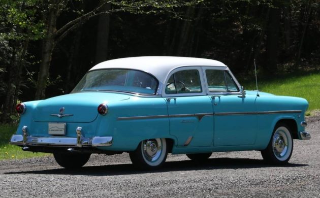 WOW, coulda been the very 1st car i bought used in ’59, although mine was a 2 door. Almost the same color, though. My ’54 was a greenish-teal color. Had the V-8 with a 3 speed stick. Previous owner had been an older farmer who probably never drove it over 35 mph. What’s a 17 year old to do? Well, break that “baby” in, of course! It had less than 50,000 miles on it and the 1st time I tried shooting thru the “blinking” red light on my way home, I blew the clutch out. Had to do some fancy downshifting without the clutch in order to get in our farm’s driveway. Next morning, I had ridden the bus to high school (no parking permit yet) and Pop jumped in the car to run an errand. He wasn’t pleased when he couldn’t shift gears, but did get the clutch replaced for me. Cost a whopping 50 bucks in ’59. Makes me wonder how much a clutch replacement is these days. Kept the ’54 a couple years until I was in the Air Force and driving a 450 mile round trip to my base in NC. Needed something that didn’t burn 2 quarts of oil each way. Traded it for a ’57 Ford Fairlane 500 2 door hardtop….that’s another story for another time…