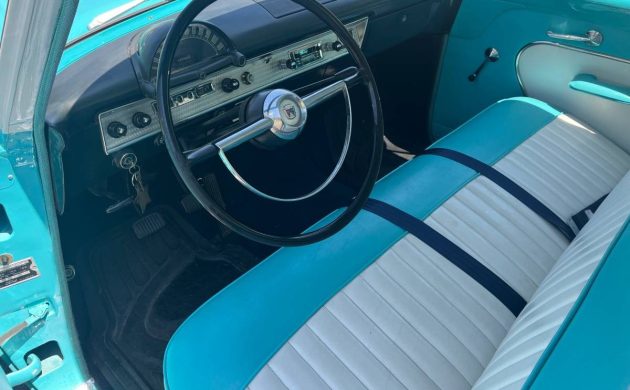 The positive impression made by this Customline’s exterior is carried over inside, utilizing the same Green and White combination on the upholstered surfaces. Close inspection reveals slight pimpling on some of the plated items, but that’s as bad as it gets. The vinyl looks spotless, the dash is excellent, with the same true of the headliner and the wheel. A retro-style stereo is the only addition to an interior that appears to need nothing.