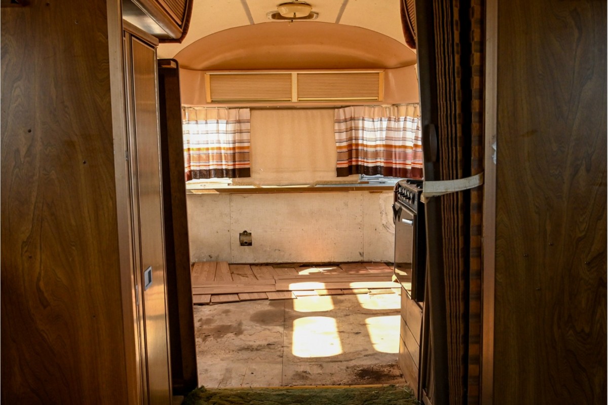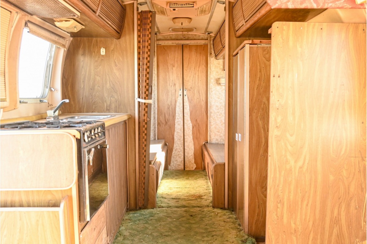On the front end of the layout is a space for the dining room table and a couple bench seats. Those wraparound windows would make for a nice view. Here’s a picture of what it could have looked like when it was new. I’m not sure what’s going on with the wood floor planks. Are they covering a hole, or is it the start of a project that just never got completed? This Airstream has a lot of potential, but it’ll take some work. One option is to restore to factory style of the 1970s. The other would be to go completely modern. Which would you choose?