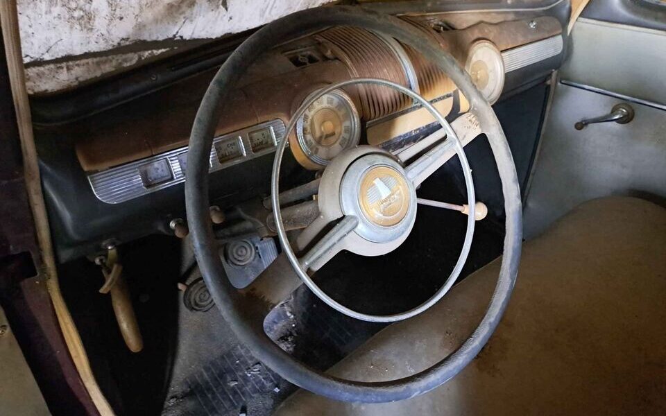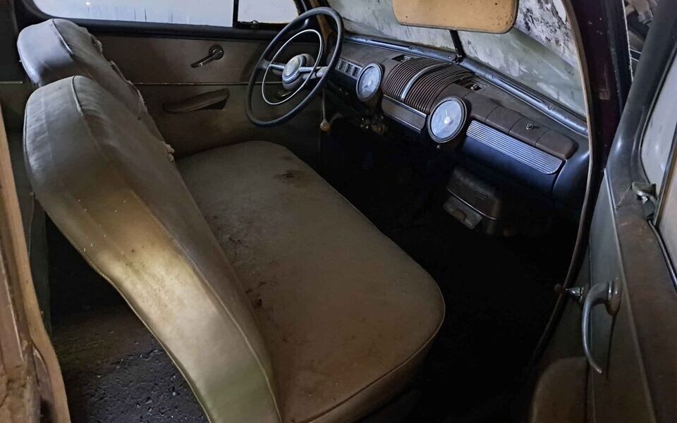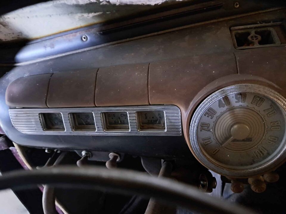 The interior is about what you would expect and is in keeping with the exterior’s barn-found vibe – it’s dusty, dirty, and stained. But, as with the exterior, it seems to all be there with the possible exception of the top part of the dashboard which appears to be missing something, a grille perhaps, or is that just an open ashtray? The entire environment really needs a complete redo but at least there’s only one seat to contend with and all of the original gauges are still in place. Another thought on that matter, many, today, like to replace original instruments with newer digital display or digitally driven analog pieces. For my money, nothing is better than having working, clean original gauges still doing what they were designed to do – these ’40s vintage components just have so much character.