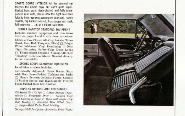The Sports Coupe more-or-less emulated the Sprint interior with its buckets and consolette. Notice under “Popular Options and Accessories” that you could order a “170 Special Six” and “4-Speed Manual Transmission,” and that’s what the original owner of our featured car did.