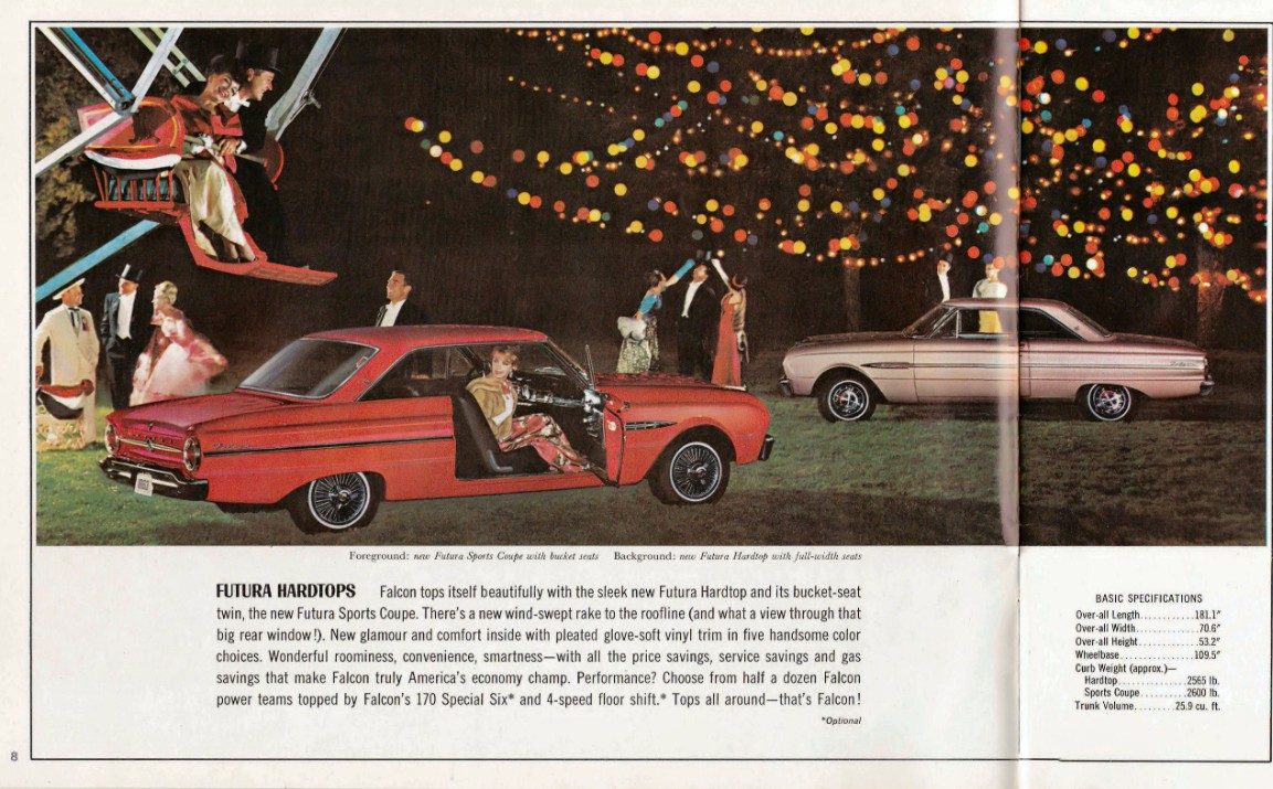 If you look at an early-1963 Falcon brochure, you won’t find the “racy new roofline” of the hardtop models; it was a midyear introduction coinciding with the introduction of the 260-powered Falcon Sprint. Upon its introduction, the upscale Futura models, which featured special interior trim and wire wheel covers, were offered in two versions: the Sports Coupe with its bucket seats and the Hardtop with a bench.