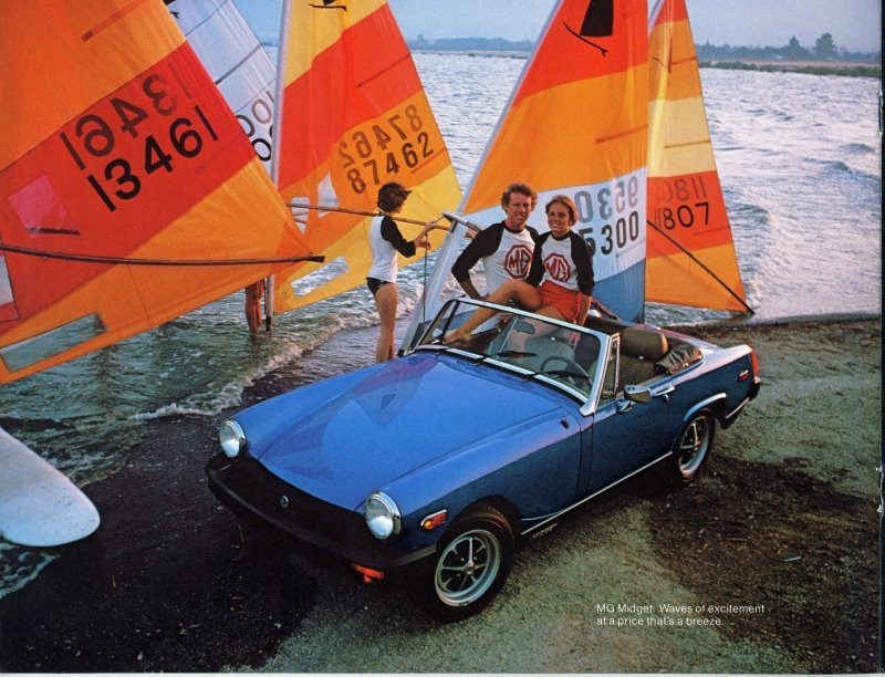 A surprising number of Midget 1500 advertisements centered on surfing and skateboarding, especially considering the “vintage” appeal of the car (even then). By 1976 the Midget was very long in the tooth, considering its roots went back to the 1958 Austin-Healey Sprite. Although the body shell had been re-engineered to fit the already smog-approved Triumph Spitfire engine and transmission for the 1500 model, there really wasn’t a significant performance increase involved. The 1500 model would continue until 1979 basically unchanged.