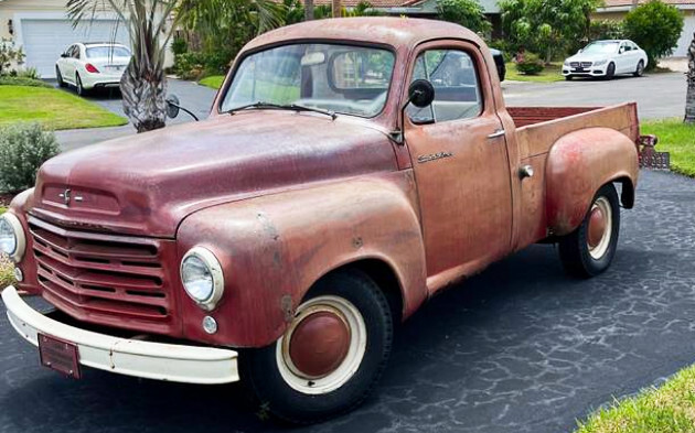 Based on the few photos, this old Scotsman looks solid. The only rust I’m seeing is on the bottom of the tailgate, but we don’t know what the bed looks like. It appears the windshield has some foggy areas on it. The inside looks good for its age and you get a glimpse of what the original red paint looked like on that simple, flat, metal dash. There’s a column shift three-on-the-tree attached to its six-cylinder engine, we’re told the directionals work, you can see the added glove compartment door that was added in ’59, no door armrests, and based on that steering wheel spinner, there was no power steering option. Although there’s a visible stain, the bench seat looks good and there’s a rubber mat and Studebaker floor mats on the floor.