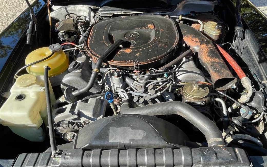 Under the hood is Mercedes’s fairly common and well respected 4.5 liter V8 engine, in this case generating 180 net HP. That rating seems a bit light to me for such a vaunted piece of Tuetonic engineering but that’s what my source claims for a North American model. The European version ponies up 215 net HP and I would assume that the difference was due to America’s more stringent emission control standards that were in place in ’79. There’s nothing said in the listing as to how this automatic transmission-equipped Benz runs and drives.