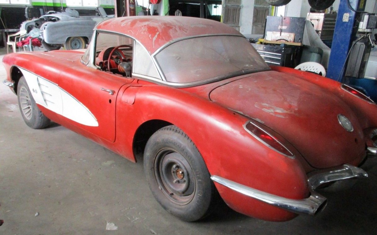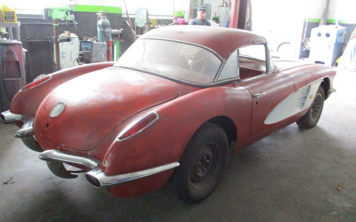 From the rear we can see that the body is pretty good on this car. It may even qualify as a car to reassemble and get back on the road mechanically if it were cleaned up properly. Other than the possible crack in the back glass of the hardtop and some trim damage to it over the passenger window, even the hard top looks good. The Roman Red paint with Ermine White coves is, of course, the textbook early Corvette look. The fact that this car originally came from California will have that crowd going crazy as well. Other than a lack of exposure to salt, someone needs to explain to me why California cars are so desirable.