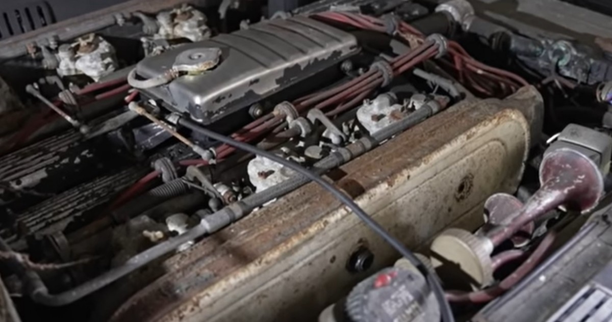 Speaking of the number plate, one of the commenters on YouTube researched the tag and indicated the DVLA shows it as being registered to a 1973 Porsche 911. That car has also been off the road since 1973, so there’s a story here. The engine bay is complete with no signs of parts missing or any unwelcome modifications. The chain-driven, quad-cam V12 featured six carbs, which will certainly require rebuilding and tuning when this Espada inevitably goes to a specialist for restoration. Even more incredible is that the hood insulation pads all still remain intact; those items are usually completely disintegrated by now, and even the tires still hold air.