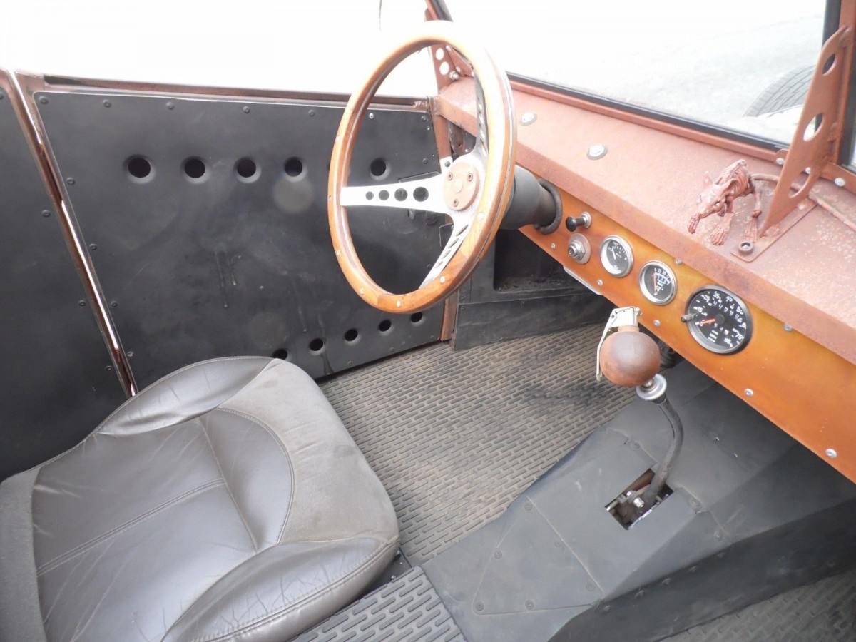 The interior is also bespoke, right down to the hand-made windshield frame. The seats may not be to everyone’s taste, but they are custom-made for the owner, so may need to be changed for the new owner. Once again there is just a multitude of detail items to note on this car. Things like the shifter knob which is made from a real hand grenade and the rat’s skeleton sitting atop the dash.