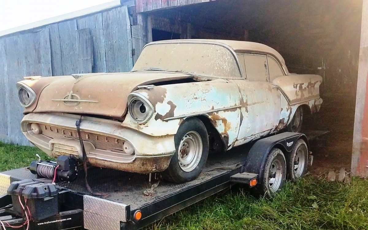 Oldsmobile’s sales brochure for 1957 proclaimed “the car that puts the accent on You!” referencing the colored accent stripe separating the two-tone body colors, and also placing an accent on the word coupé, because nothing calls Paris to mind like… a 4400 lb two-door with a big V8 with acres of chrome? This true barn find in Harpers Ferry, West Virginia could be yours with the high bid here on eBay where bidding has topped $1800.