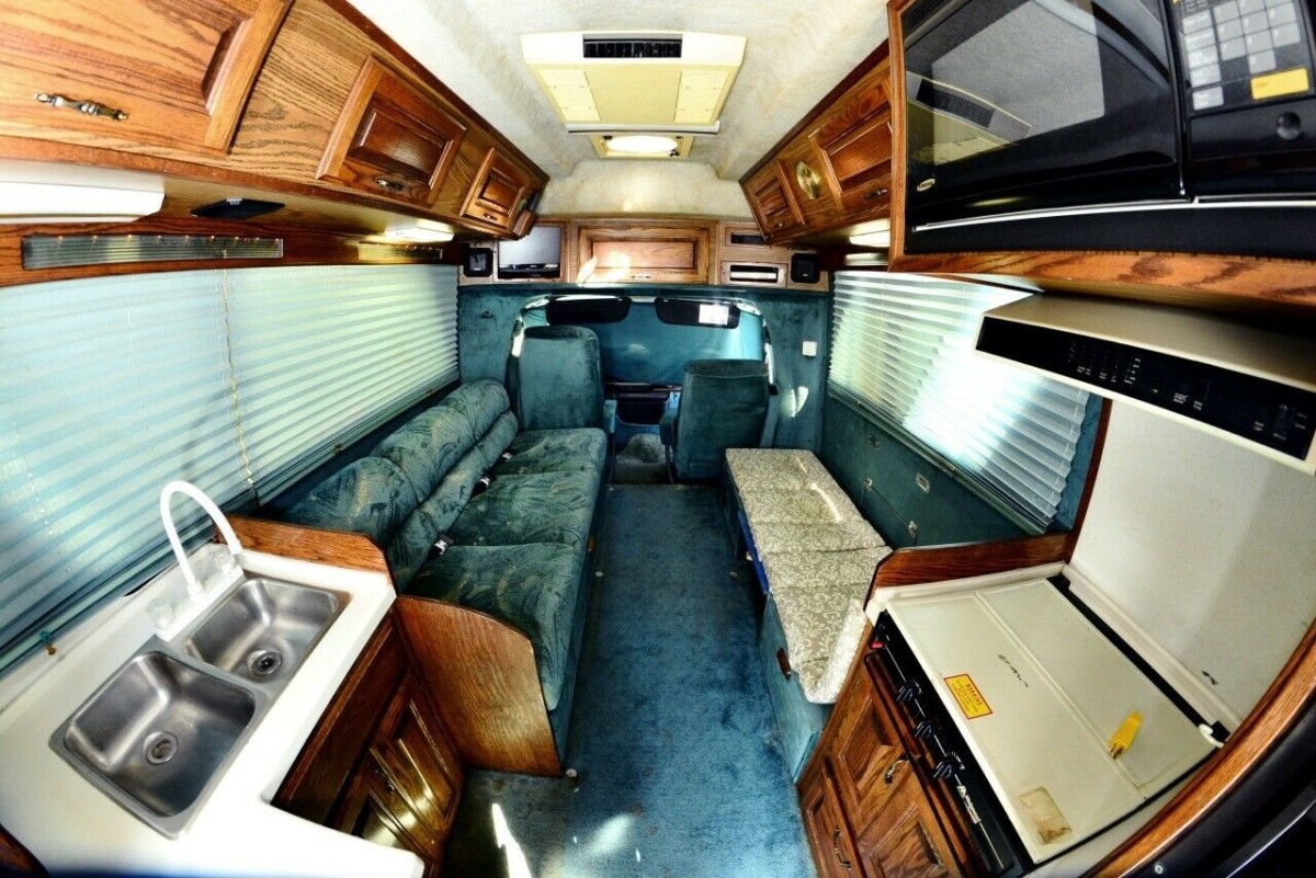 This Chinook conversion has also clearly been loved, as the interior remains in exceptional condition. Sure, it’s straight out of the early 90s when green carpeting was still a thing and fake wood paneling was everywhere. Off to the left, the green couch can unfold into a bed that can comfortably sleep one, or perhaps two kiddos. The bench across the way could also accommodate some slightly uncomfortable slumber, and the seller mentions that some of the tables and benches can also convert into a bed. Another option is the front passenger seat, which can swivel around and recline.