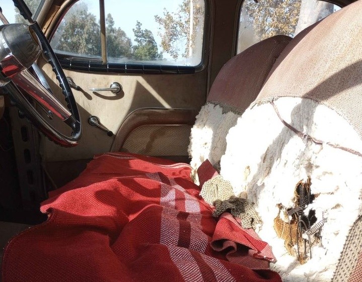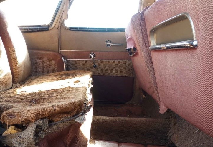 Demerits include a crack in the side glass and the rear wing window. The upholstery is on its last legs, the carpet is missing and the headliner is bad. The wheels are not original, but the original hubcaps are included. The paint is hanging in there, but worn down–especially on the hood. It’s got patina to spare.