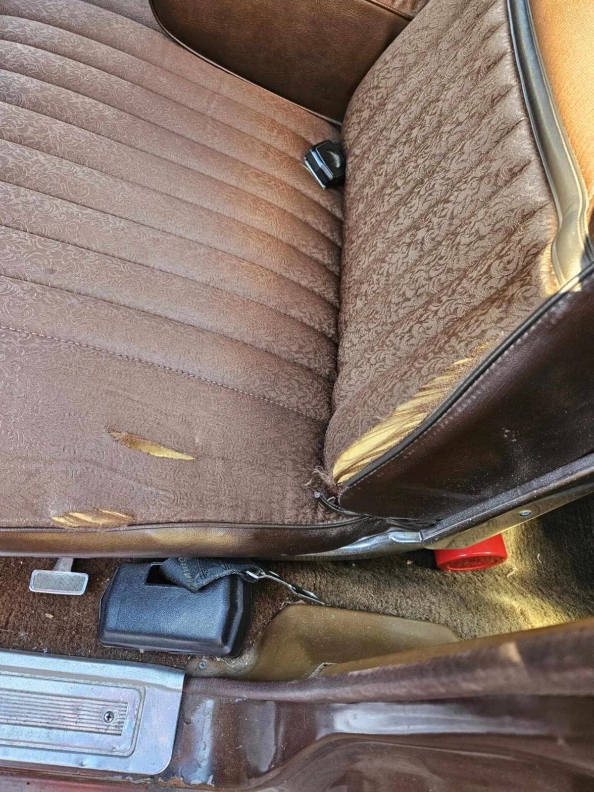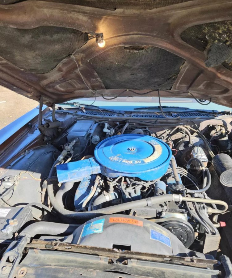 This LTD’s interior could stand as one of the car’s highlights. The first owner trimmed it in vinyl and cloth with a brocade pattern, and the only issues worth noting are slight carpet fading and wear on the outer edge of the driver’s seat. The new owner could prevent further deterioration by fitting a slipcover, although an admittedly brief online search uncovered a reproduction seatcover in the correct materials and color for under $500. If the buyer added $220 for a carpet set, the interior would present nicely. The dash is excellent, the pad is crack-free, and the faux woodgrain hasn’t faded or lifted. The seller rebuilt the air conditioning system so that it blows ice-cold. Other creature comforts include a power trunk release, and an AM radio and tape player.