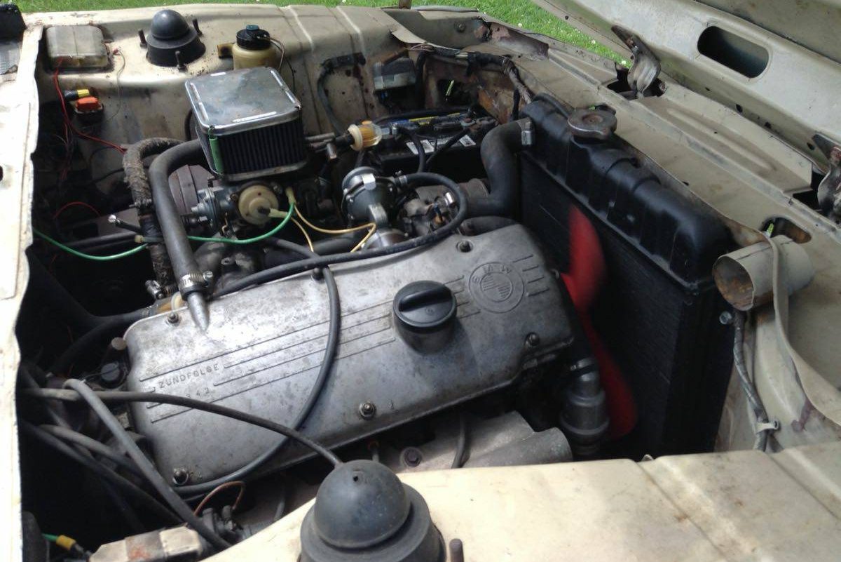 Nothing looks too amiss under the hood; reassuringly, the fan is in motion in this photo, so we know the engine runs! The shock towers, a common spot for rust, look good, too. The M10 inline-four is a stout piece if properly maintained, and the 2002 enjoys exceptional support for both restoration and modification, so this car could probably just be driven, or it could be taken pretty much anywhere a new owner’s imagination wants to go.