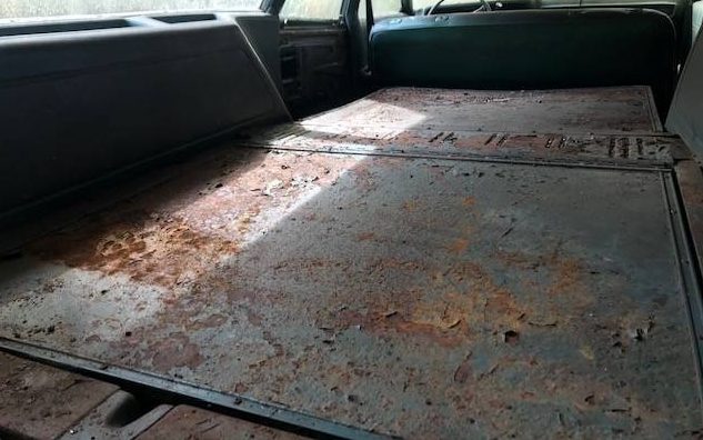 The seller advises that “This is a project car with plenty of rust“. Actually, it doesn’t look as rusty as one might think and the interior cargo bed looks rustier than the outside. There is surface rust bleed-through in places and the lower quarters clearly have problems. But the body’s not terrible, the long fuselage sides look to be reasonably straight. It’s hard to say what the box attached to the tailgate is for, some sort of lock mechanism perhaps to keep whatever was supposed to stay out of the passenger compartment from leaving the car entirely? The seller mentions that the outline of the Washington State Soil Management decal is still visible on the driver’s door.