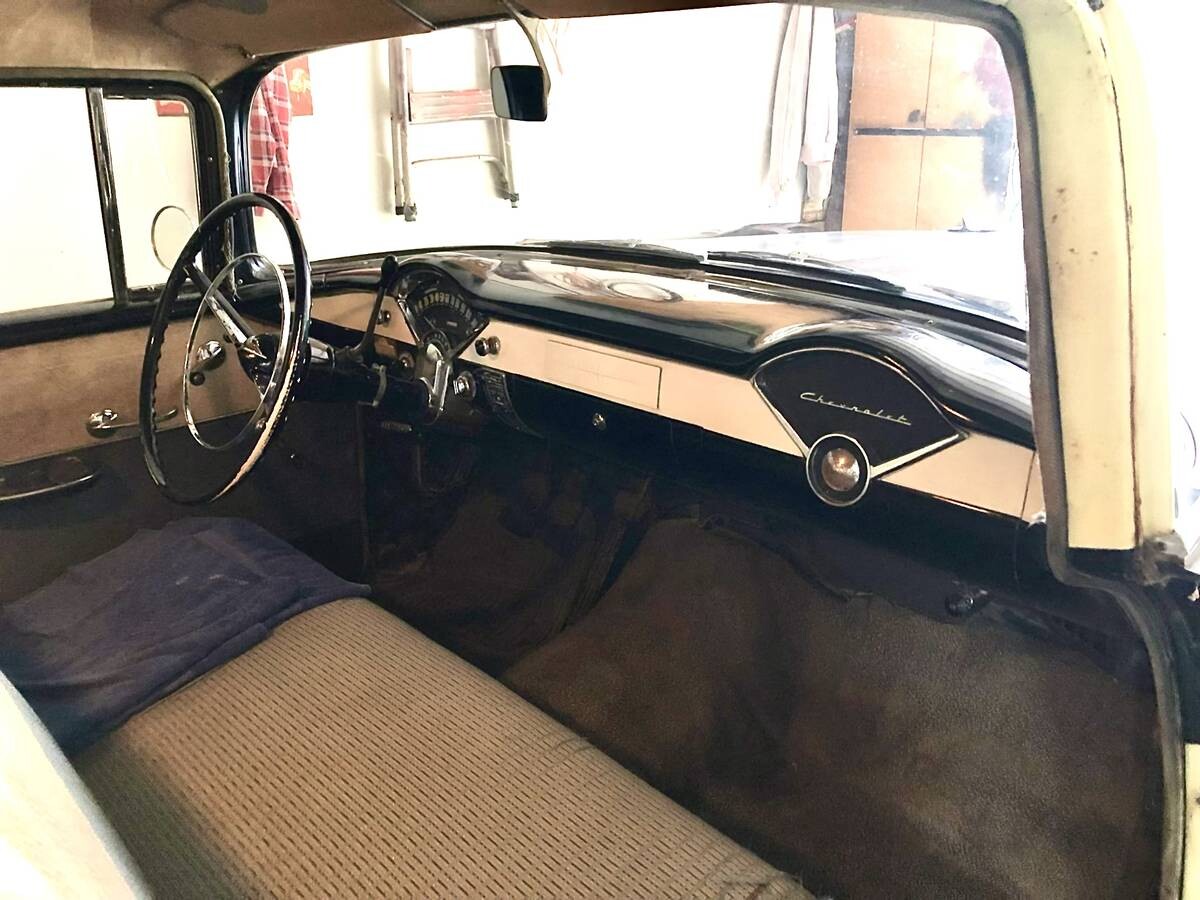 My father bought a ’56 210 4 door new, he died in ’59, I saw to its maintenance until ’68, and possessed it off and on, my mother and sisters using it off and on, beginning way back in ’56 it was the only car my friends’ parents would let them ride in for long distances – to the Langhorne Speedway outside Philly for example, or to the Jersey Shore from Philly -, then much later, in college the only car my friends would trust to drive us to NYC from CT, it always started, always ran smoothly, no issue going 70 mph, and later, my daily transportation, since I did not dare park my Corvette anywhere for a long period of time (like an hour) since it was a target for being stolen – a hubcap did get stolen, I had marked the interior with the VIN, and the guy had the balls to sell it back to me. Since the crooks were running the police department (Waterbury, CT in 1968) I just paid him the $25 and put it back on the wheel. But nobody tried to steal the ’56 Chevy. IF I were to buy this, I would install seat belts, dual master cylinder, and front disc brakes – the brakes were the weak point and it was easy to over do them, radial tires, repaint it, and drive it. No museum will ever want it, so have fun with it. The upholstery is not original, the original was very fragile, and was beyond repair at 4 years, Sears seat covers thereafter. The Powerglide transmission was bullet proof, only one problem, once, in its 140,000 mile life, and that fixed itself.