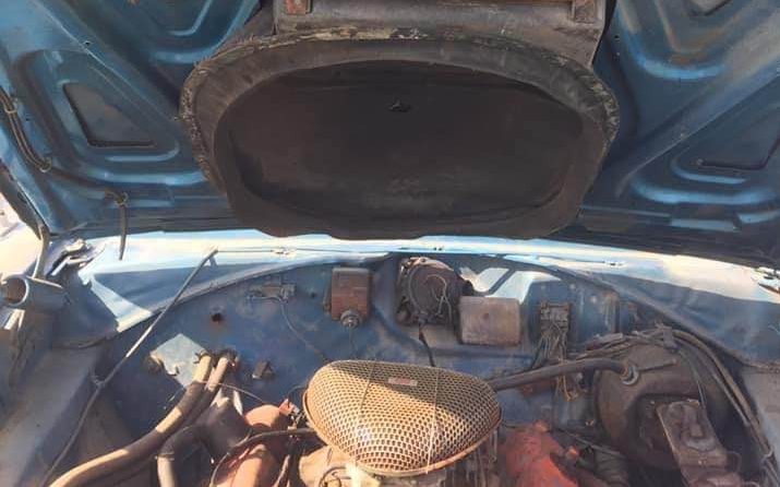 The interior is a bit funky looking, the upholstery appears to be more fitting for a boat than a car. It’s odd in that the door panels and seat upholstery, with their white piping, match but the carpet is a contrasting gray. Perhaps the upholstery/door panels are a later custom job? Another surprise is the lack of a center console and a black steering wheel, which is present in an otherwise sea of blue.