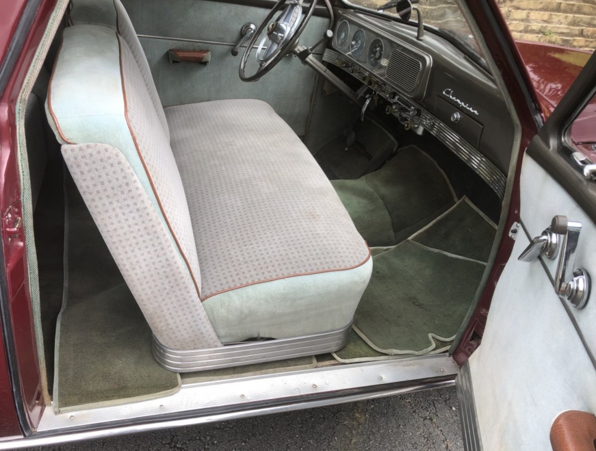 Inside the car is an attractive interior, with a combination of grayish-green fabric, brown trim, and some brightwork. It looks like the doors, seats, and carpet could use a good shampoo, but otherwise no flaws immediately stood out. The seller says they have gone through and fixed everything that needed fixing – almost all the electronics, gauges and accessories work with the exception of the vacuum-controlled wipers. Also, the radio lights up but doesn’t produce any sound.