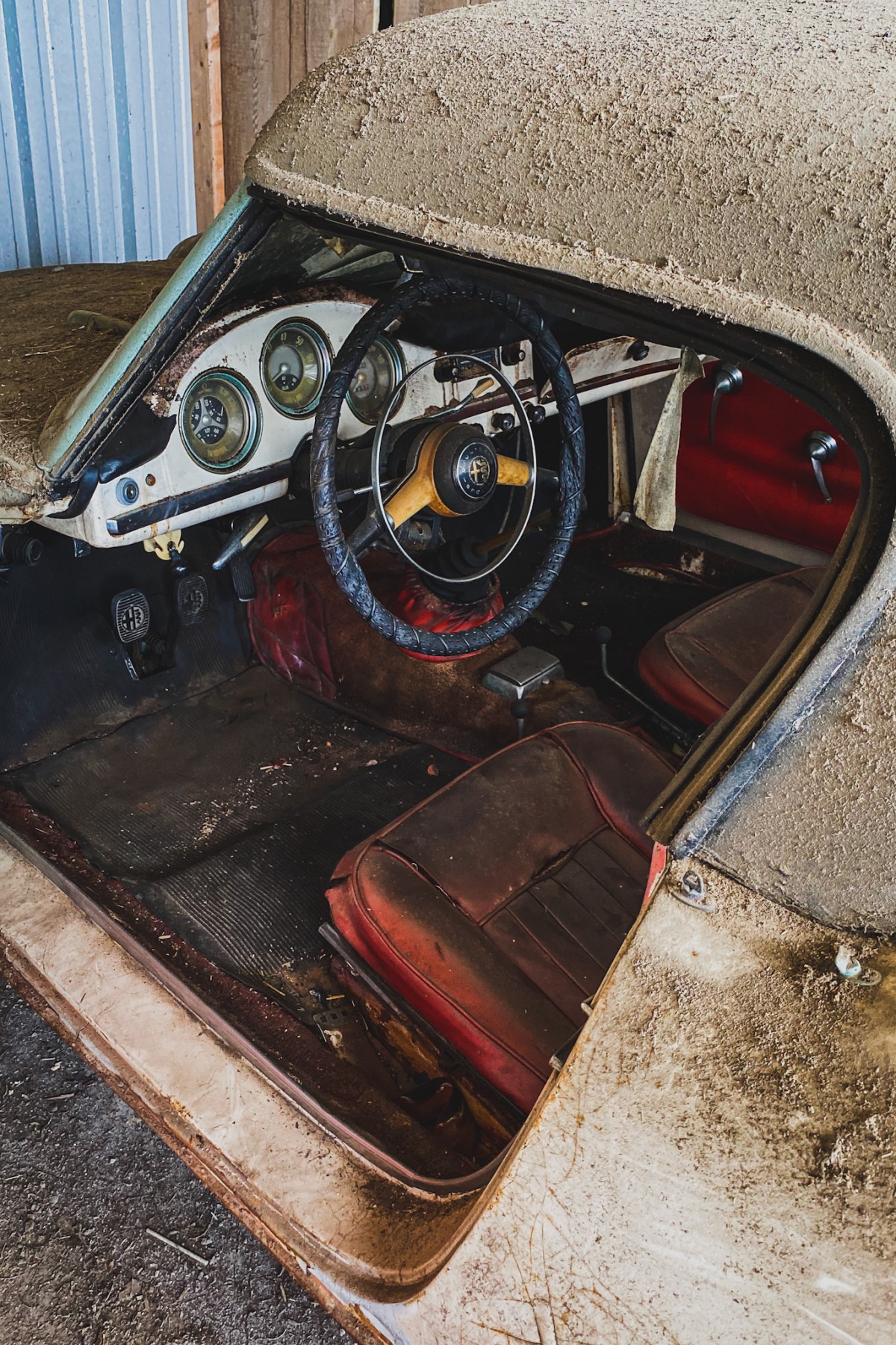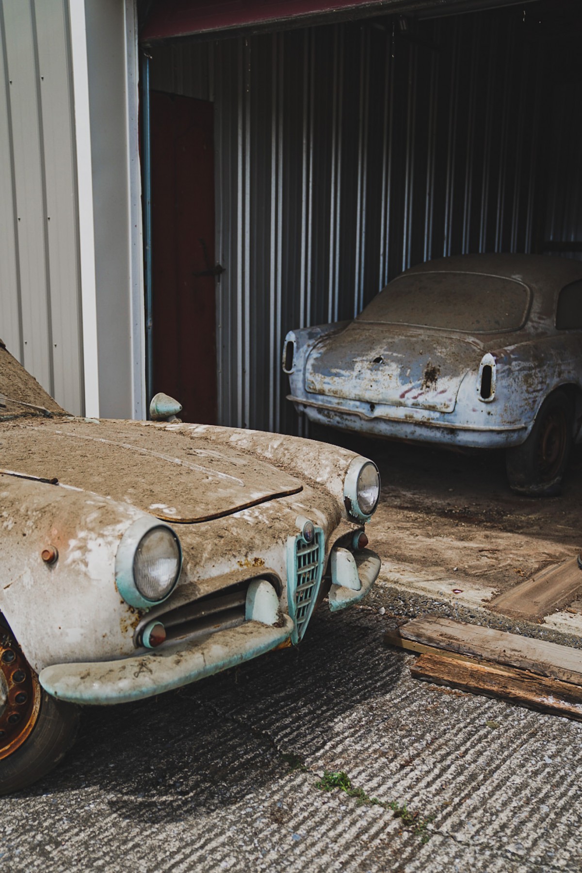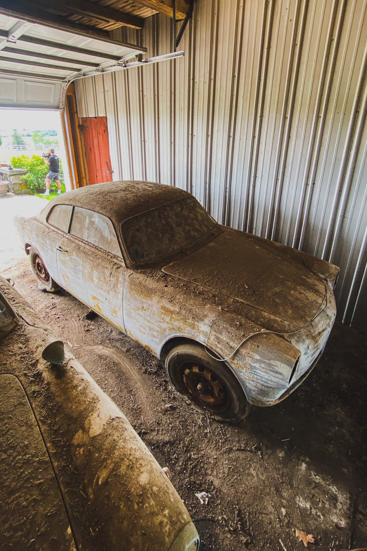 “In the second “barn”, more like a pole building were the two more desirable cars – a 59 Giulietta Sprint and 59 Giulietta Spider. Both were California cars that ran when parked; 40 years ago!”