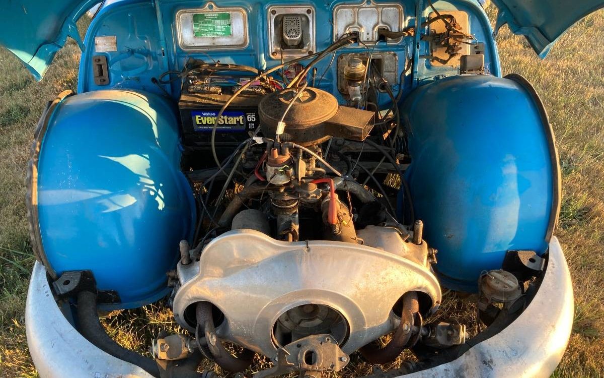 The owner of this Dyna Z says they have owned it for more than ten years and acquired it after it had been sitting for decades. Being a 1954, this example is a first-year model with an all-aluminum body supported by a steel tube frame and sill supports. Beginning in late 1955, the main body section was pressed in steel and by 1958, the only body parts still made of aluminum were the engine cooling shroud and bumpers. Based on the photos, the body of this one appears to be in good condition without any big flaws, with only some dings and corrosion on the front bumper. The hood and front fenders are integrated into one giant panel that opens for engine access, and the front doors are of the suicide-type. It wears a quintessentially French shade of blue which appears to be a repaint, based on some overspray. With its smooth, rounded body, the Dyna Z was also perhaps the most advanced-looking French car of 1954, as during this time contemporary offerings from Peugeot, Renault, and Citroen were either still based on pre-war designs, or had separate fenders. Photos of both the undercarriage and trunk show solid surfaces.