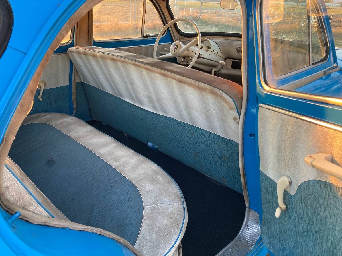 The interior appears complete but in need of a thorough cleaning. The upholstery on the front bench seat is badly torn and the rear has at least one hole in it. A pair of bench seat covers would be sufficient for the time being. The dashboard is a neat 1950s design with all the instrumentation and switchgear arranged in a pod containing a half circle speedometer. Seat belts were also added at some point for at least a little safety for the passengers.