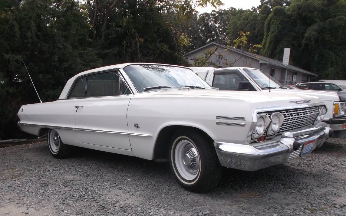 I have been fortunate to have owned a number of cars.. I find them, fix them up, all are licensed and I drive them. Keep the stable to around four or five. Some are stone stock, others are hot rodded in one form or another. One of my dream cars is the 63 Impala SS 409. In white of course. Six years ago the father of a friend found one (true barn find) and he was talented as hell, so he had it show car ready in a year. He untimely passed and his collection was dispersed among his close friends… His was a white two door hardtop just like this one. Poverty hub caps are usually a give away… Great find…