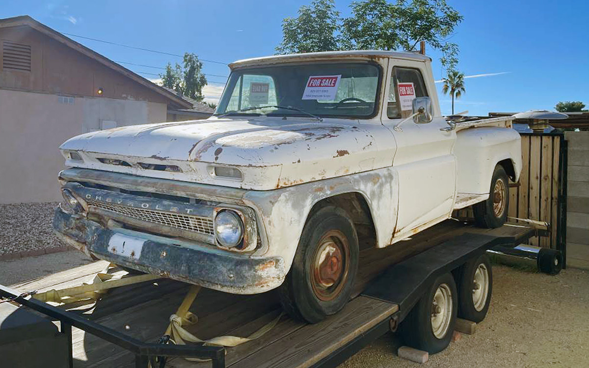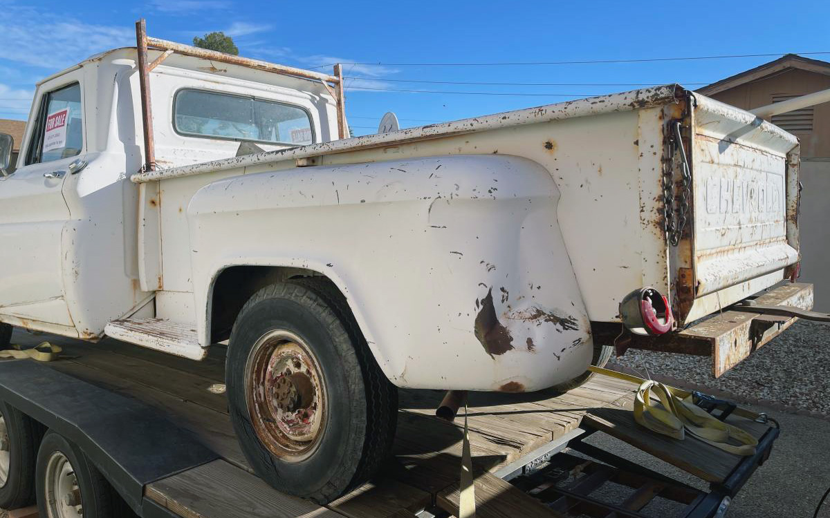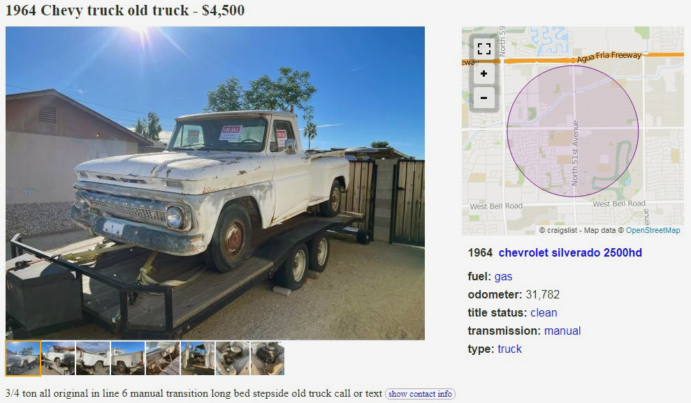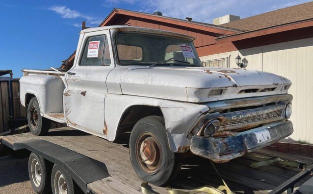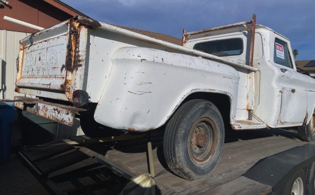 Chevrolet offered three different lengths of their Stepside bed: 6.5 feet, 8 feet, and 9 feet. This appears to be the middle one, an 8-foot-long bed. There are no profile photos to know for sure, but the seller refers to it as a long bed. This 1964 Chevrolet C20 Stepside can be found here on craigslist just north of Phoenix, Arizona, and they’re asking $4,500. Here is the original listing.
