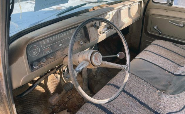 Then there’s the interior, which looks much nicer than any part of the exterior does. This one has a three-on-the-tree manual, which is a sure theft deterrent, and it appears that the floors have seen better days. The seller gives zero information about rust or really anything else other than saying it’s all original, it’s a 3/4-ton with a straight six, and it’s a long-bed stepside. Floor pans are also available, of course, but I hope it doesn’t need them. Otherwise, this interior could be cleaned up and reupholstered in a three-day weekend.
