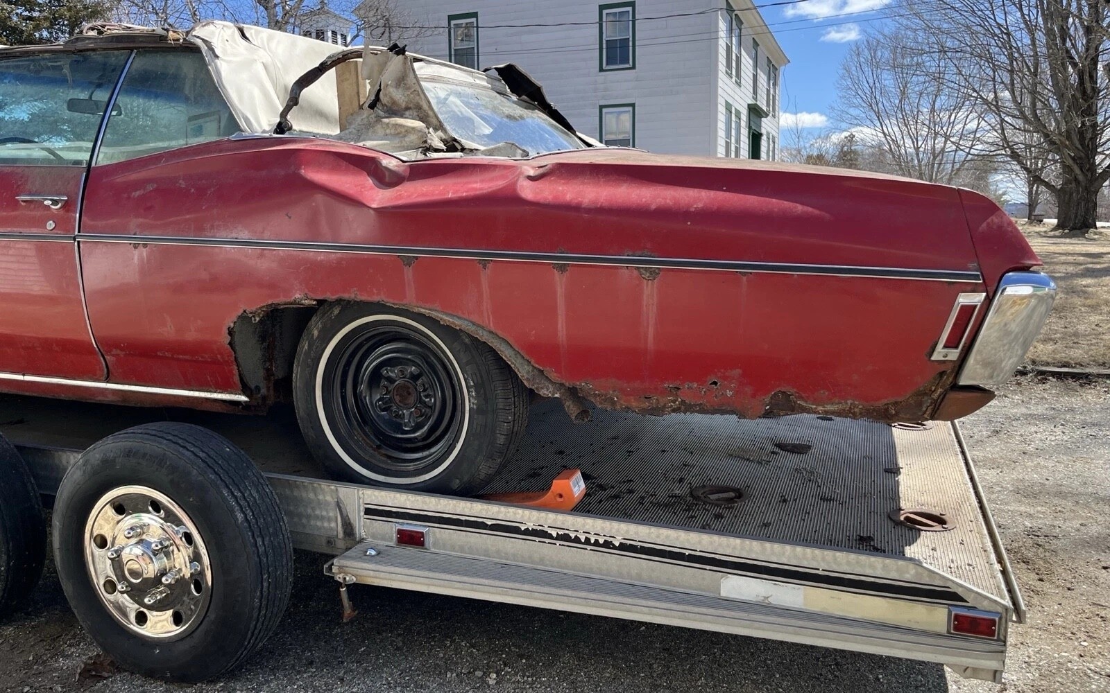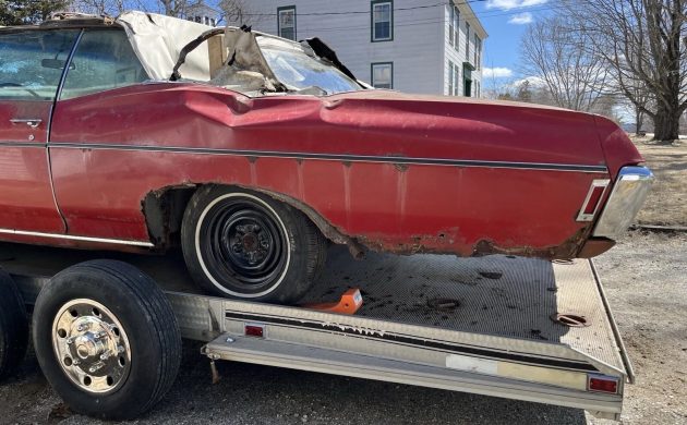 As beautiful as the New England area of the United States is, driving cars around these parts during the winter can easily cause metal deterioration, with this Impala showing quite a bit of rust on the body. At some point, another unfortunate incident occurred when a tree fell on the driver’s side quarter, causing more exterior damage in addition to the corrosion. It’s a certainty that lots of panel work will be required here, but the seller believes it’s not beyond saving, and points out that it’s straight except for the one area. Whether the convertible frame rails can be straightened and salvaged is questionable, but a new canvas roof will undoubtedly be required.