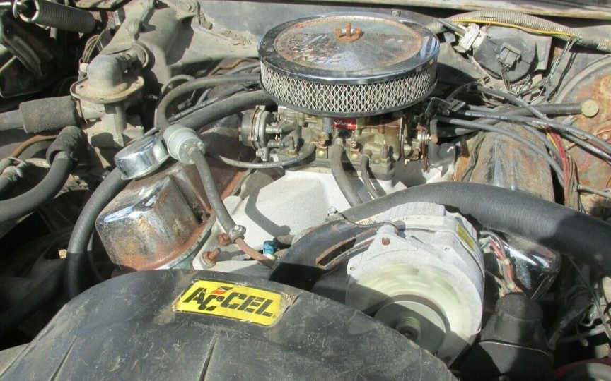 This Trans Am is a runner as the seller claims that it “runs and drives great“. The 250 net HP, 455 CI engine appears to have undergone some mods with an Edelbrock carburetor, aluminum non OEM intake manifold, and an open-element air cleaner. The Accel decal would be indicative of an upgrade too though there appears to be a GM HEI unit providing the spark. This Trans Am was, at one time, A/C equipped but there is no sign of the Frigidaire A-6 A/C compressor, a component that frequently goes missing on muscle cars of this era. GM’s Turbo-Hydramatic 400, three-speed automatic transmission was still in residence in ’74 but it wouldn’t be long before that component would be replaced with a lessor model as engine size and power shrank.