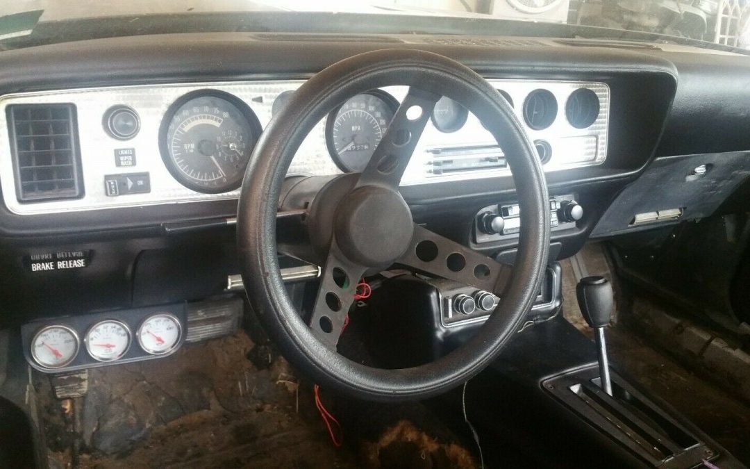 This Trans Am’s exterior is mimicking an earlier version with its single, stem to stern, strip as opposed to the full flight firebird decal, also sarcastically known as the “Screaming Chicken”, emblazoned across the hood. The seller states that this Trans Am was originally white with blue trim, a commonly found combination in ’74 but now it’s wearing primer gray with an off-white stripe. There is no obvious rust-through though there is a rusting crack making itself known under the rear window and the lower edges of the body, as in the quarters, in particular, have a bondoed-up look about them. That may not be the case but it wouldn’t be a surprise if it’s true. The rear bumper cover has seen better days, and so has the front one for that matter. Note the hood scoop, it’s ambidextrous, it can be worn forward or backward…The honeycomb wheels are a nice inclusion and a break from the more typically found Rally II’s that frequently adorn Trans Ams.
